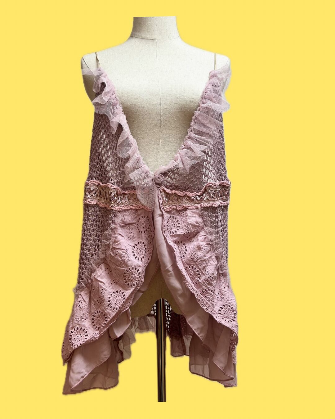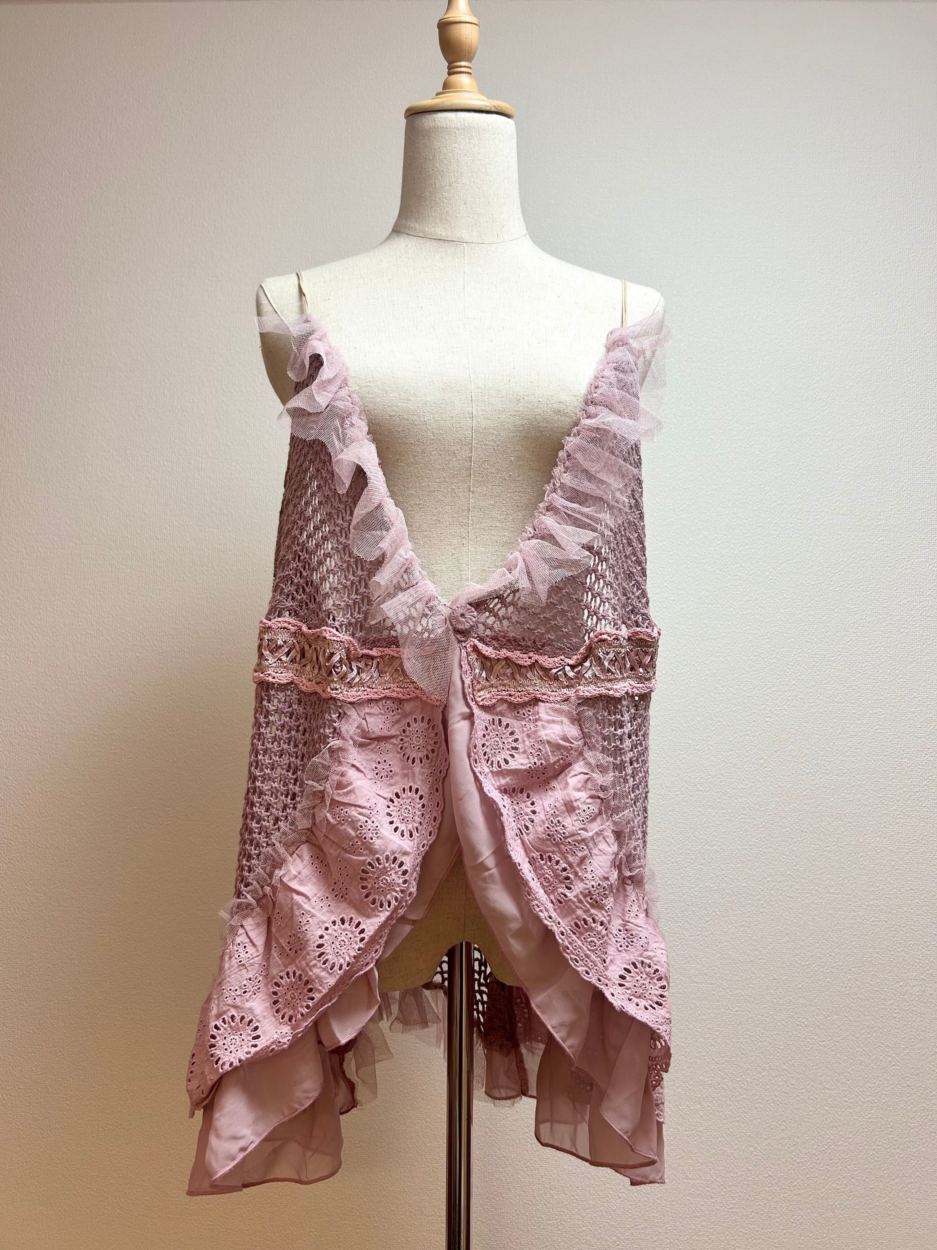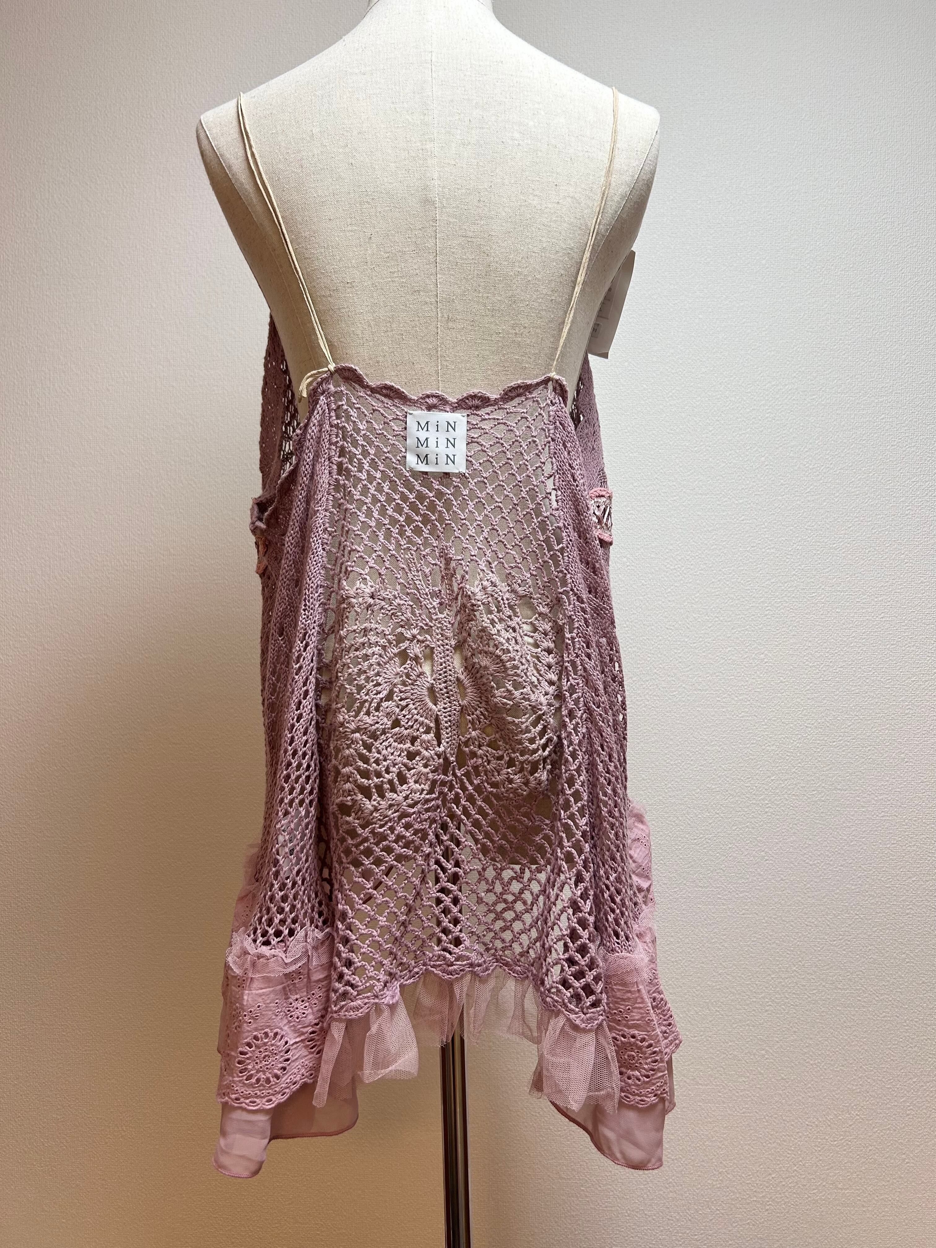 スモーキーピンクとレースが可愛いチュニックベストです。