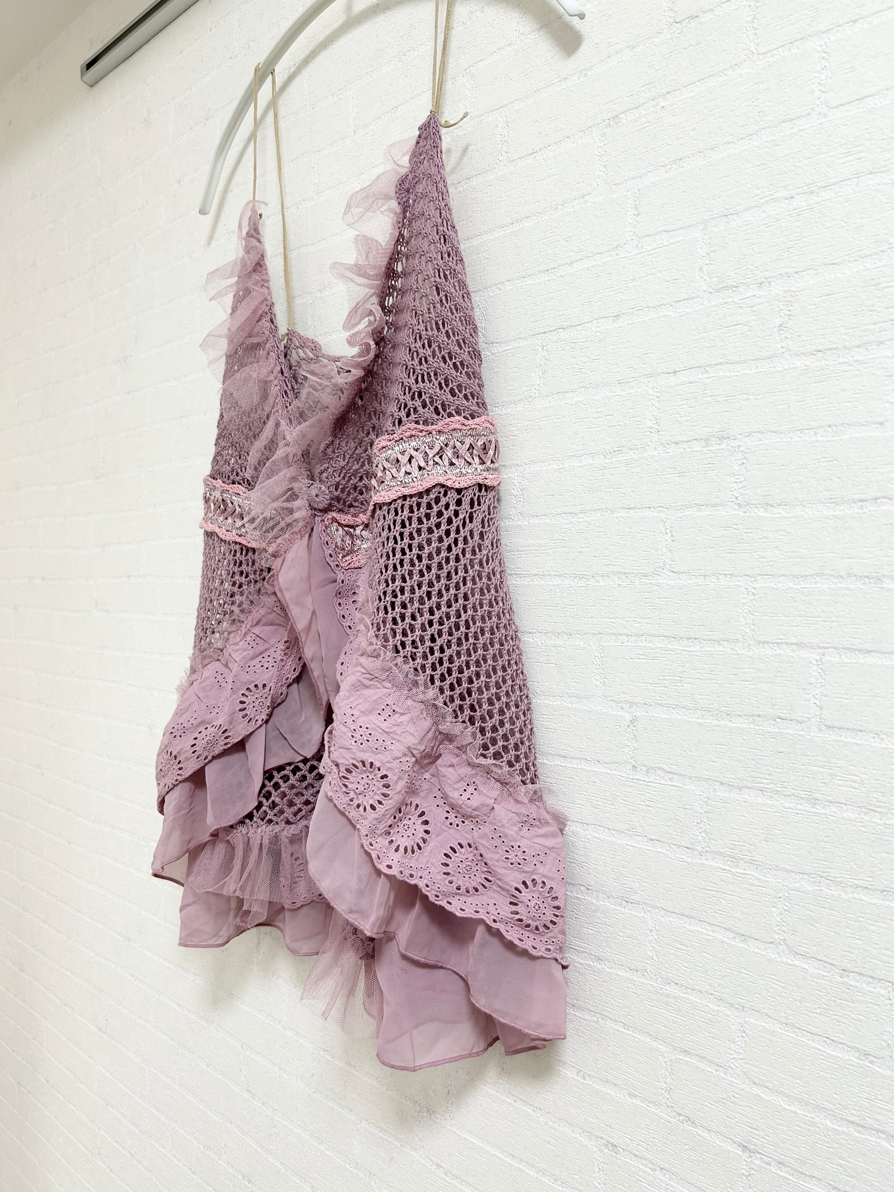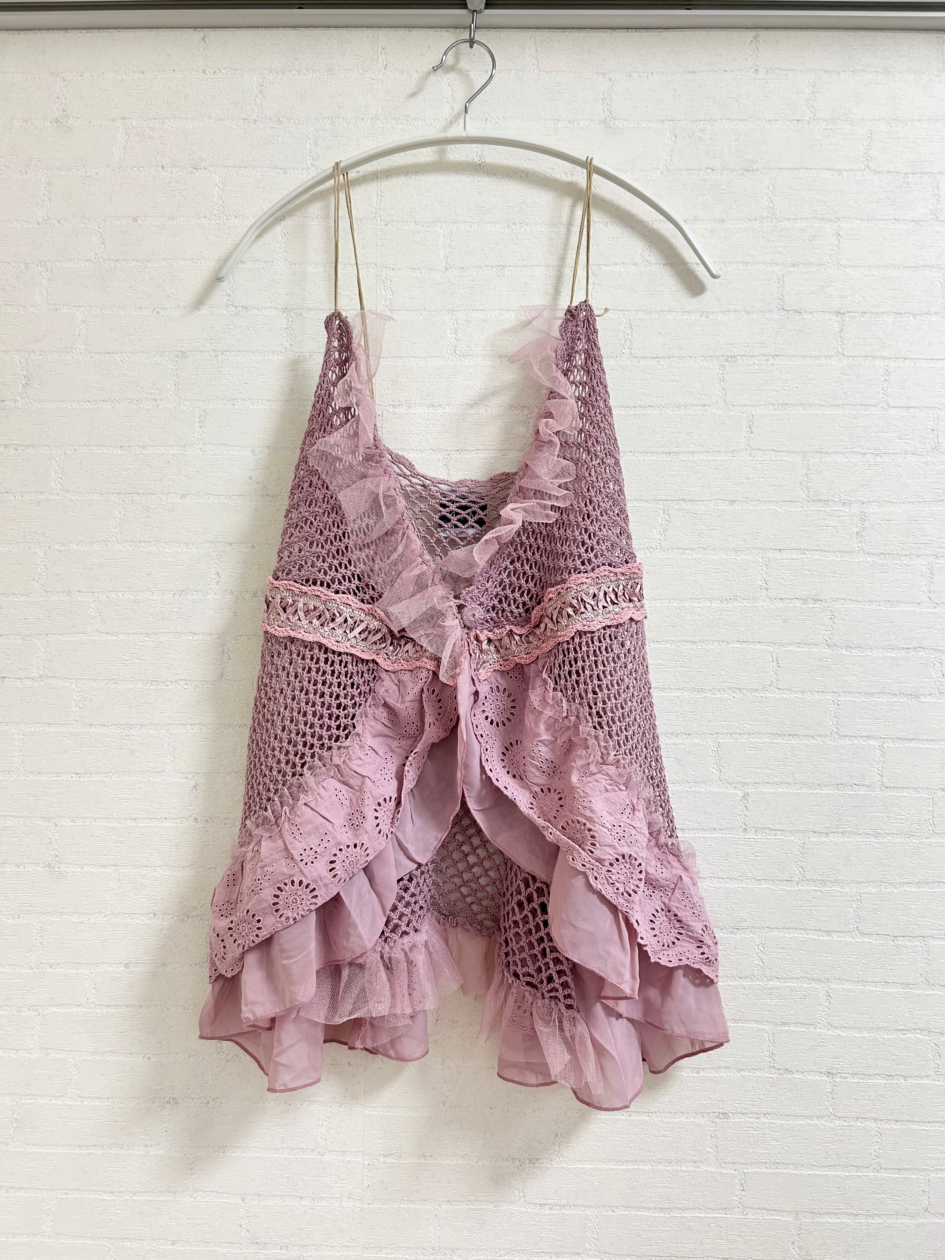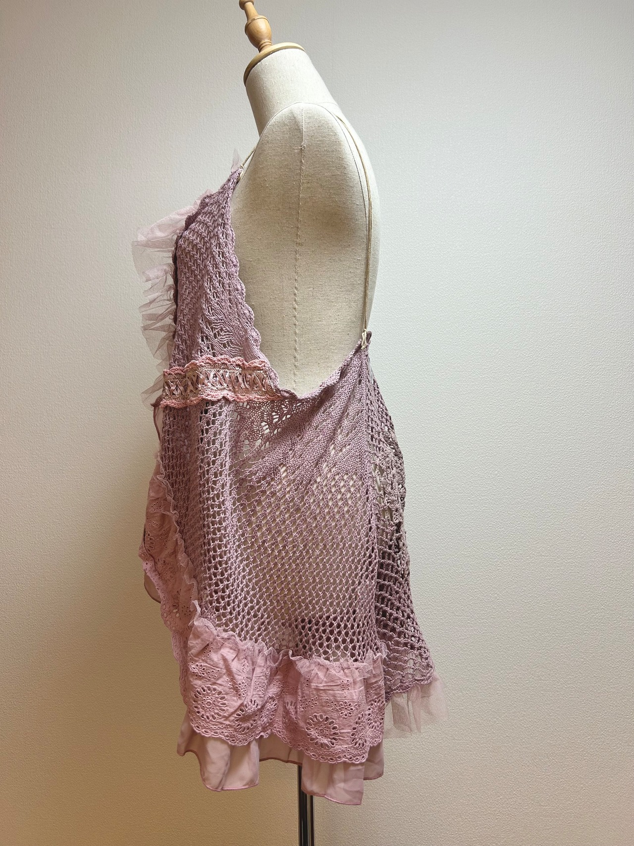 スモーキーピンクとレースが可愛いチュニックベストです。